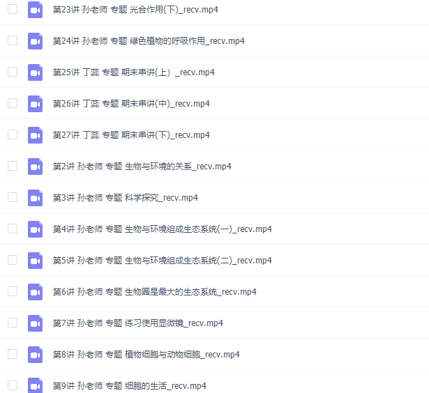 此课件来自简单学习网校,初一生物同步提高上学期课程。此课件主要知识点包括:认识生物、生物与环境的关系、科学探究、生物与环境组成生态系统、生物圈是最大的生态系统、练习使用显微镜、植物细胞与动物细胞、 细胞的生活、细胞分裂和分化、动物体的结构层次、植物体的结构层次、单细胞生物、藻类植物、苔藓植物和蕨类植物、种子植物、开花和结果、绿色植物与生物圈的水循环、光合作用、期末串讲。