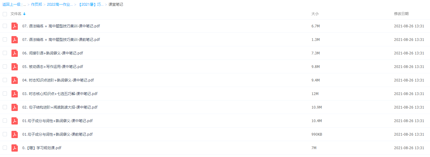 此课件来自作业帮网校,2021作业帮高一牟恩伯英语暑假视频课程,包含视频课程和讲义资料 。主讲牟恩伯老师写作逻辑以英语语言逻辑为根,以高考考试规律为本,帮助学生精确打击高考考点。此课件主要知识点包括:语法精练 + 高中题型技巧集训、间接引语+熟词僻义、被动语态+写作运用、时态知识点进阶+熟词僻义、 时态核心知识点+七选五巧解、句子结构进阶+阅读跳读大招 等视频